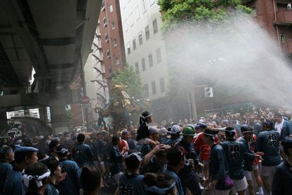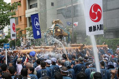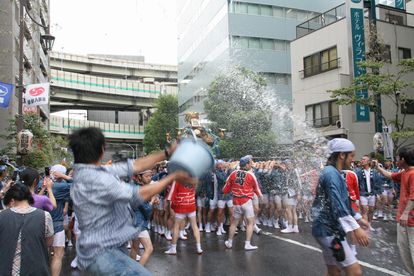 神輿に向かって盛大なシャワー。