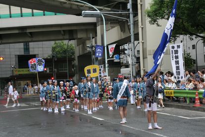 旗を持った先頭は、箱崎交番前を曲がって…。