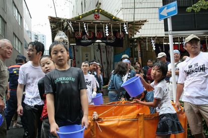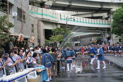 箱崎・北新堀町の神酒所前では、すでに消防ホースから盛大に!
