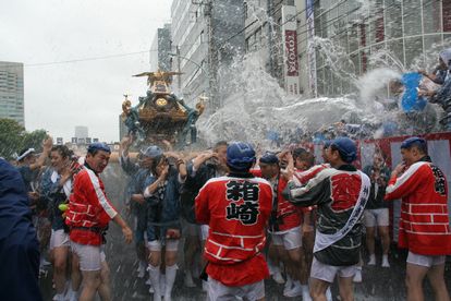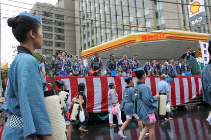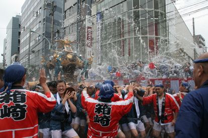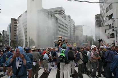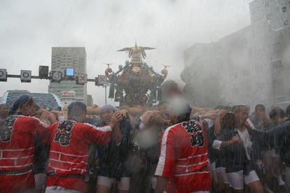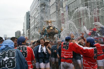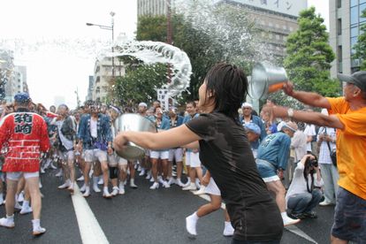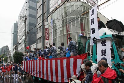 トラックの荷台に水を貯め、豪快に浴びせるのは佐賀町会が発祥。