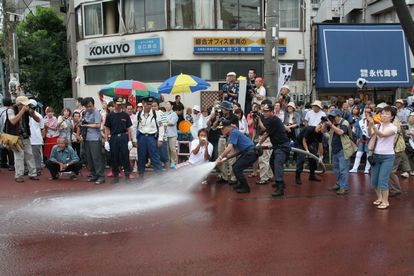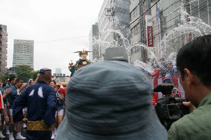 永代橋西詰めで放水中、カメラ濡らさないでね〜