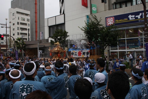 そして、先行する新川の神輿も…。いきなりのバケツの水かけ!