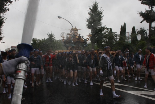消防ホースからのシャワーを浴びつつ、前だ!前だ!