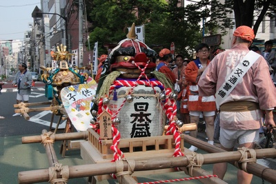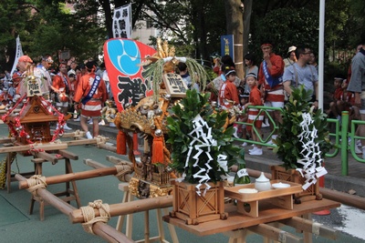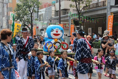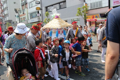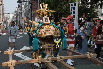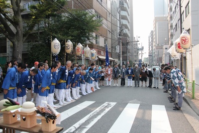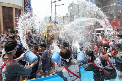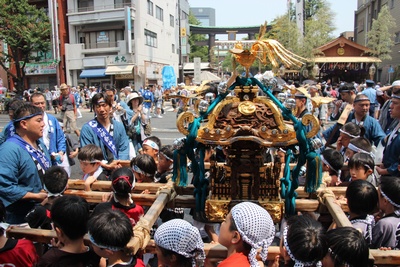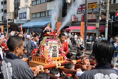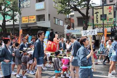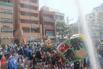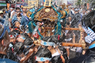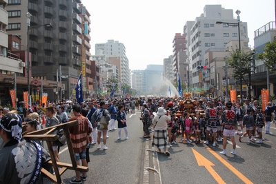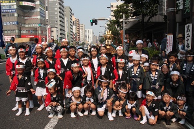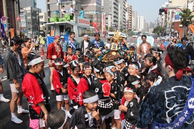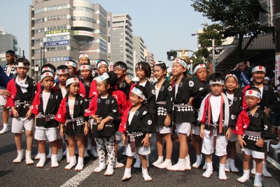 江東区門前仲町・富岡八幡宮前の永代通りを通行止めにし、47氏子町会の子供神輿が担がれました。