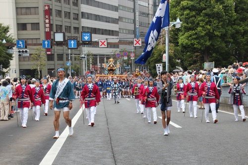箱崎神輿の後方に、大勢の担ぎ手・神輿・見物客