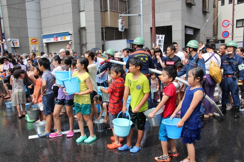 佐賀町会のバケツ隊が、トラックの上で待ってます…。