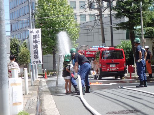こちらは日本橋消防団第三分団による消防ホース体験